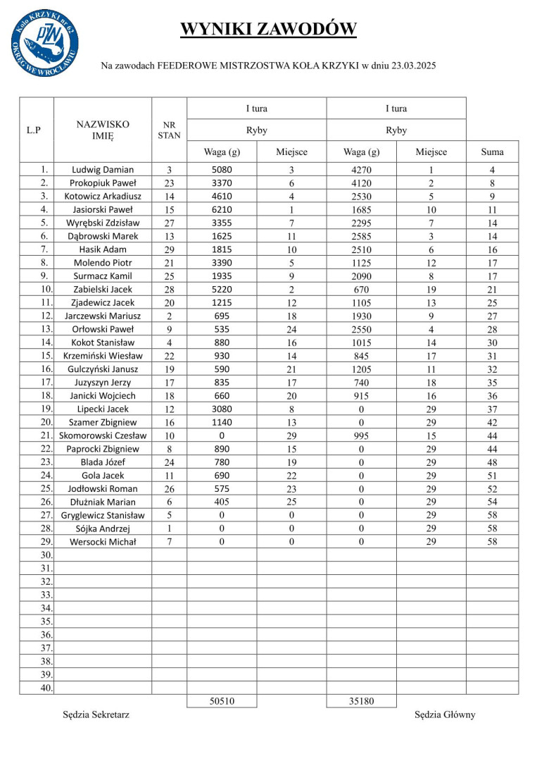 ZAWODY WĘDKARSKIE " Feederowe Mistrzostwa Koła tura 1 "